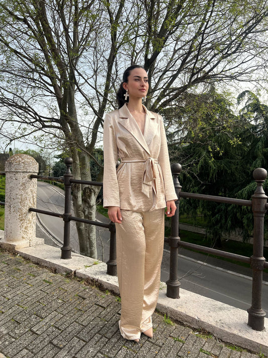 Pantalone Donna Palazzo in Tessuto Laminato Oro – Eleganza che Brilla