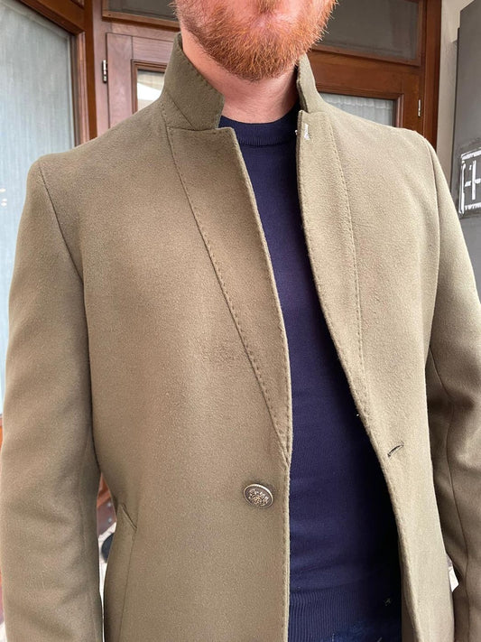Mandarin collar coat with button. burnished Dolomites