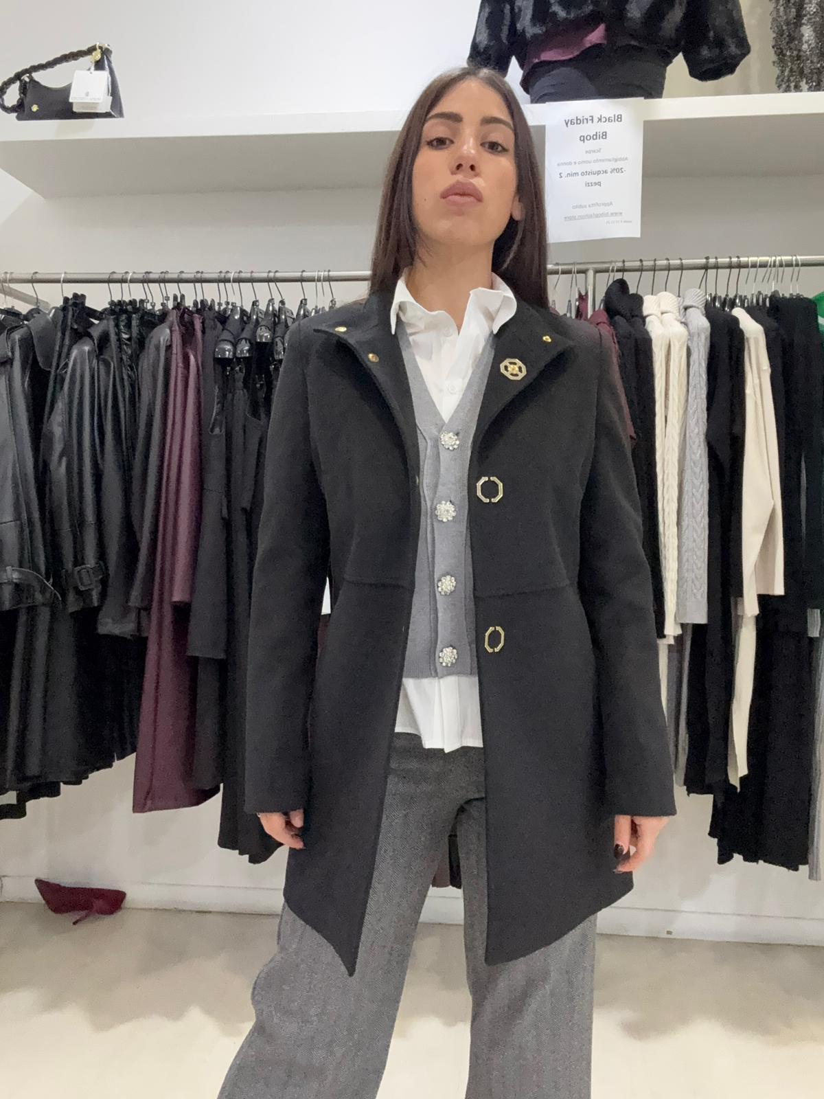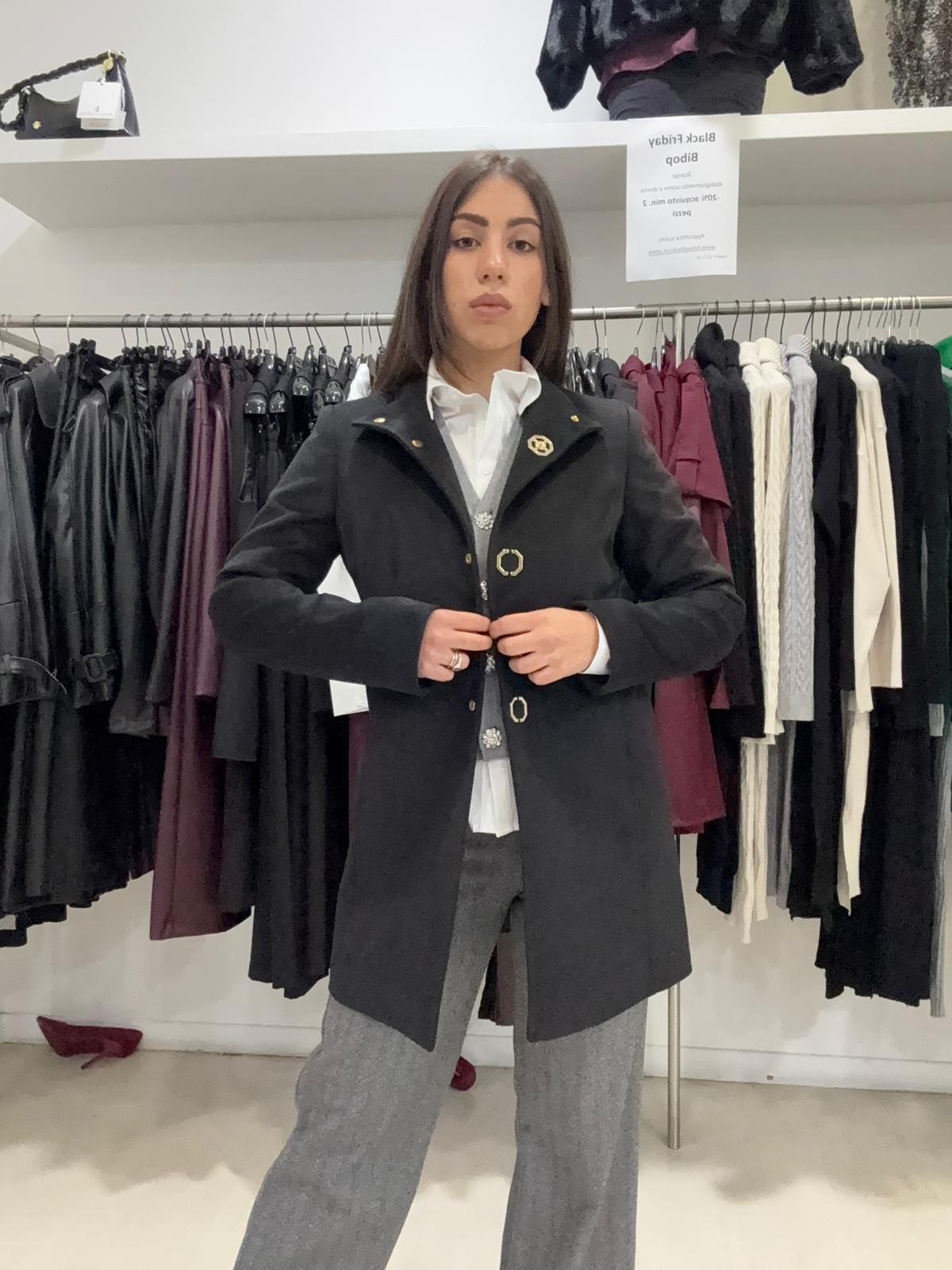 Elegante e raffinato, dal taglio corto stile coreana con bottoni dorati che impreziosiscono il capo. Perfetto per look chic e contemporanei.