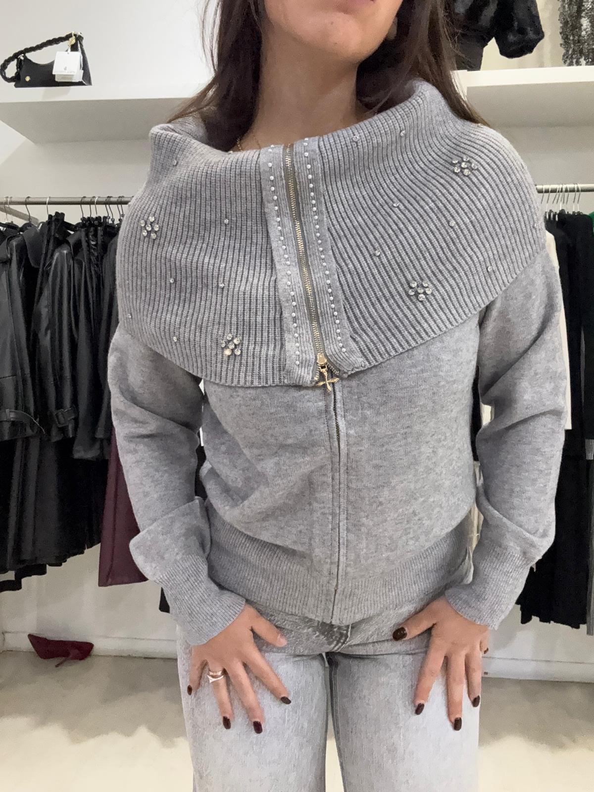 Il colletto rifinito con strass aggiunge un tocco elegante e brillante, ideale per chi ama distinguersi con dettagli raffinati. La zip frontale permette di personalizzare l’apertura del collo, rendendo la maglia versatile per look casual, chic o leggermente più audaci.