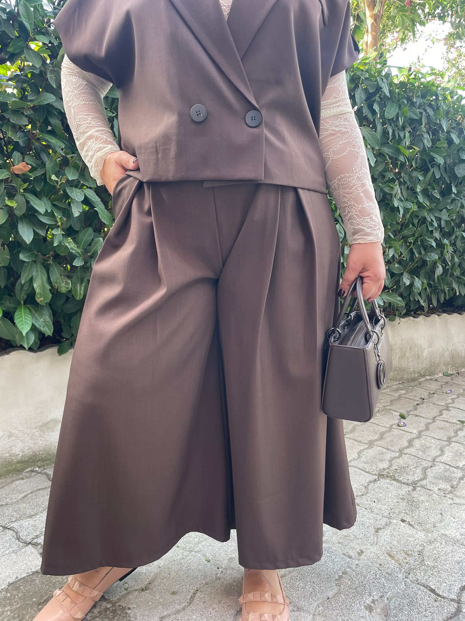 Comoda e sofisticata, la pantagonna crop unisce la libertà del pantalone all’eleganza della gonna. Realizzata in tessuto leggero, cade ampia e fluida donando movimento e stile. Perfetta per creare outfit moderni e versatili, dal giorno alla sera.