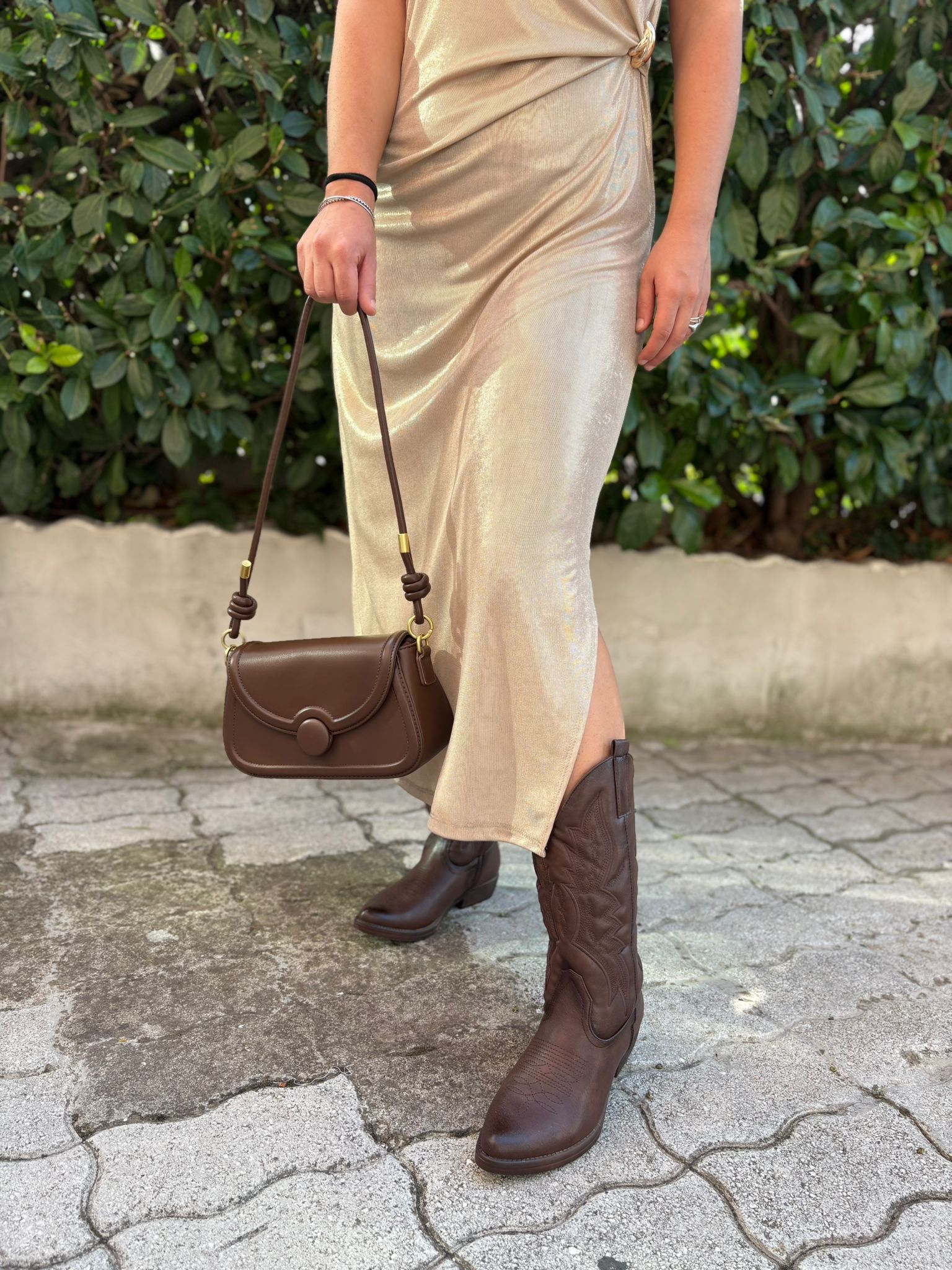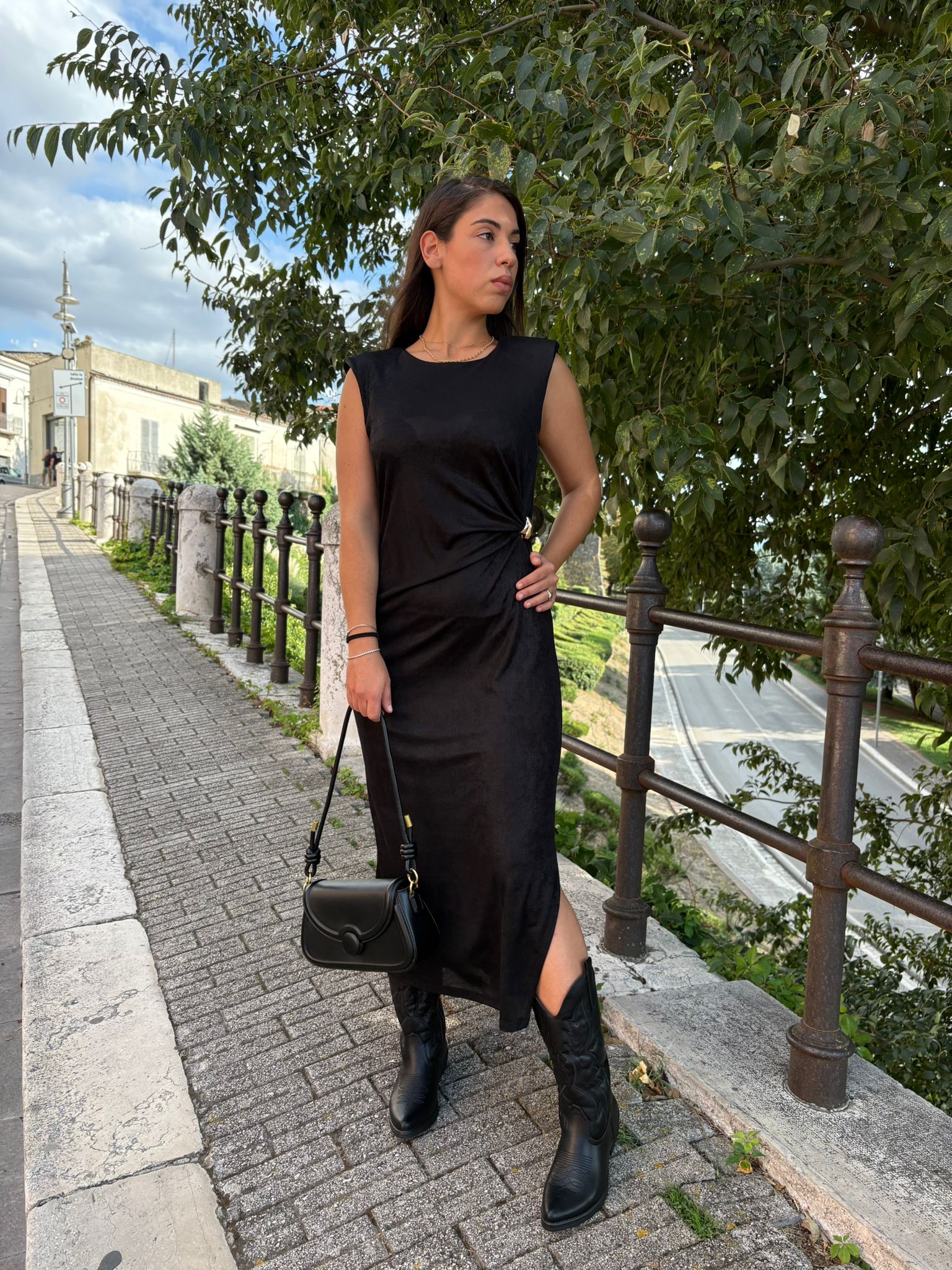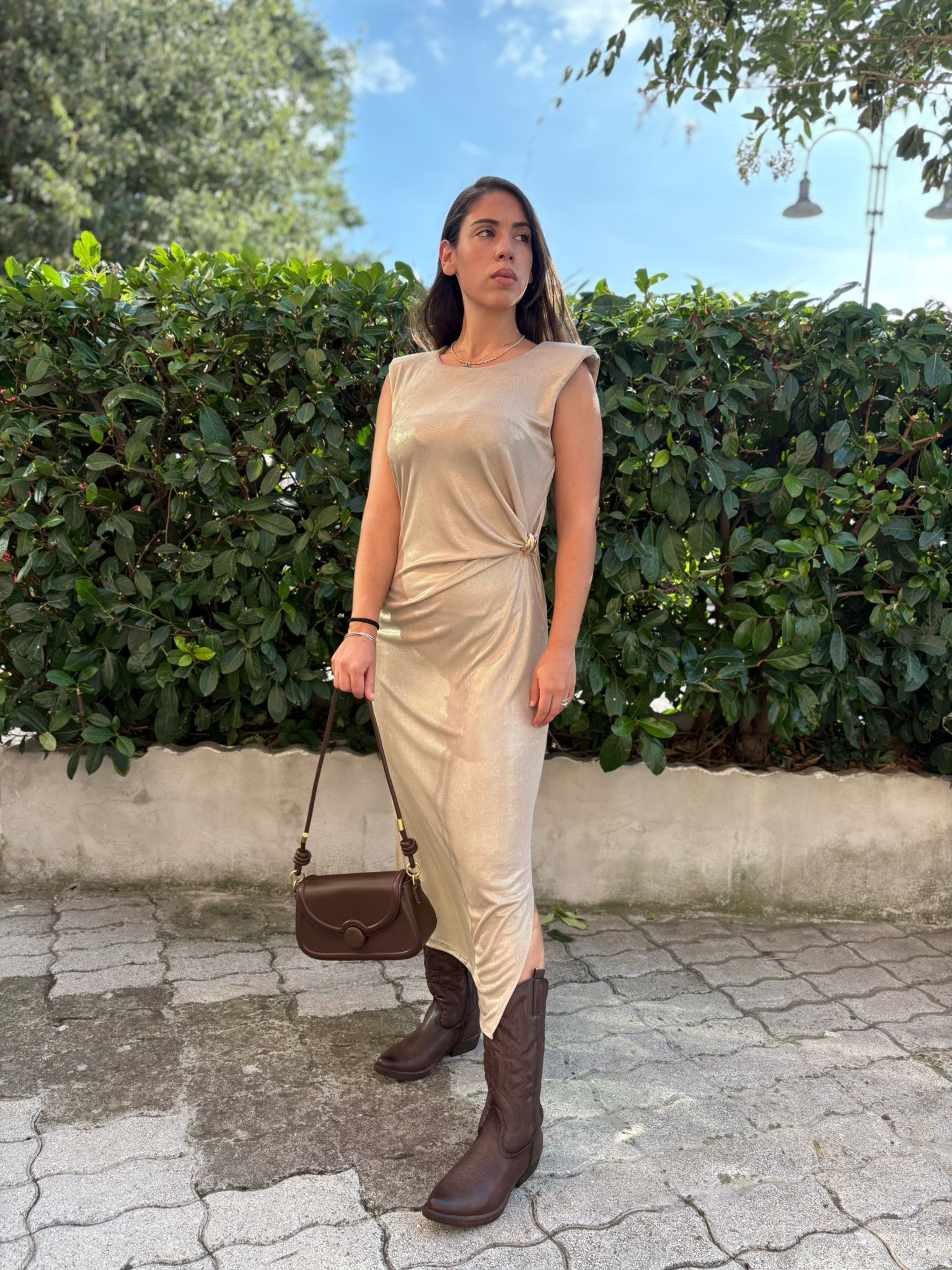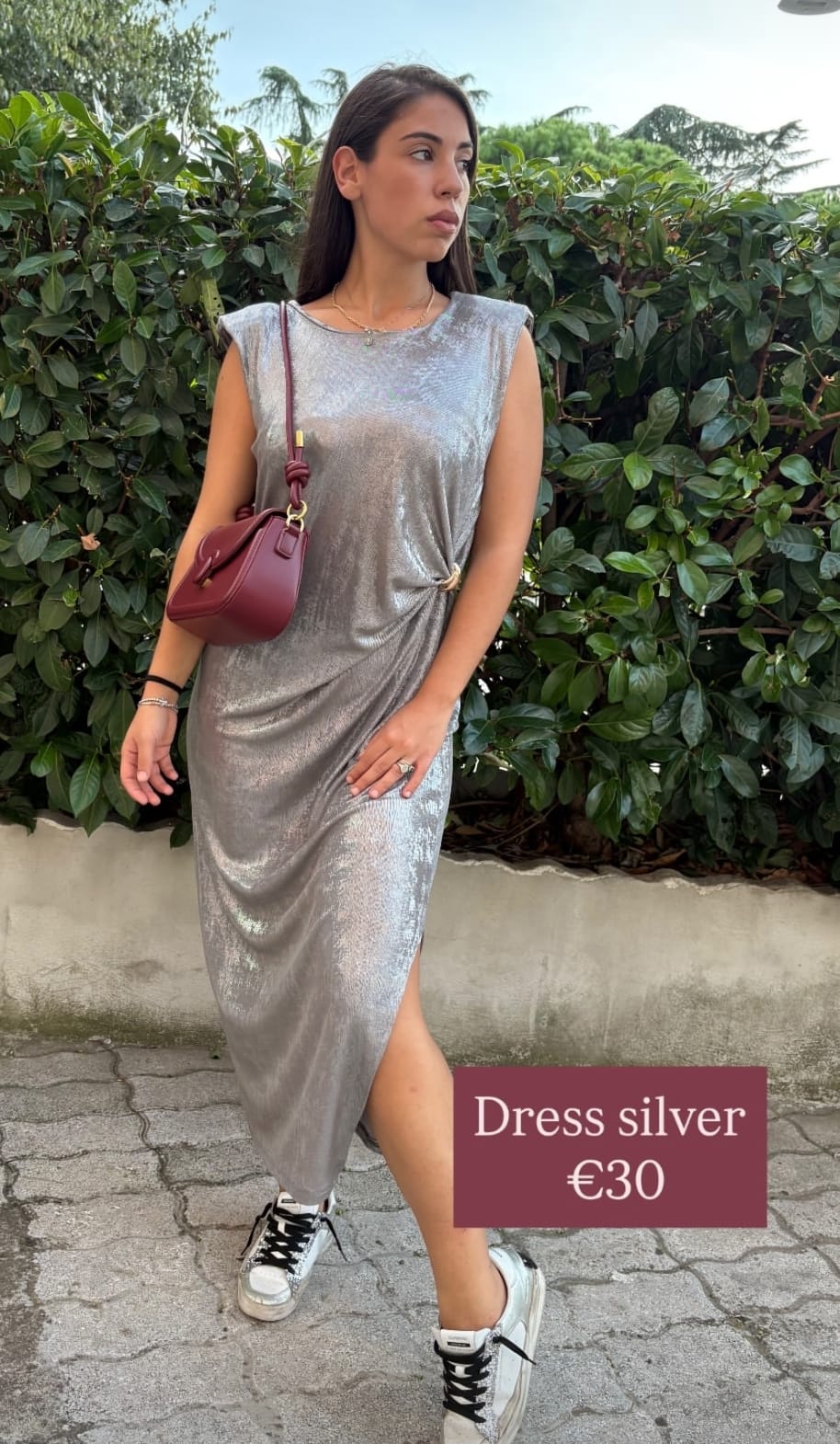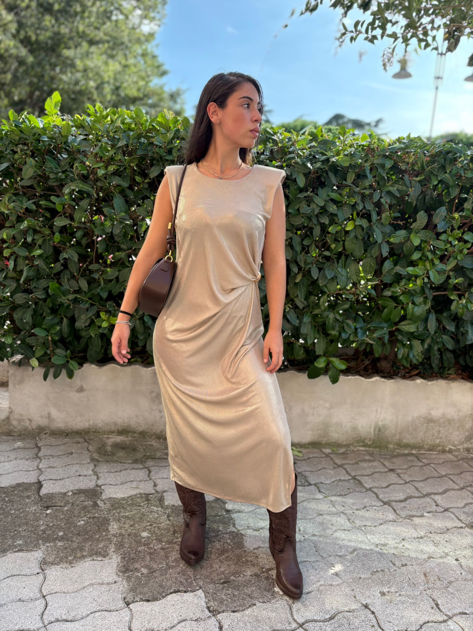 Elegante e luminoso, questo abito smanicato in tessuto lamé cattura la luce ad ogni movimento. La linea semplice ma raffinata esalta la silhouette, rendendolo perfetto per serate speciali ed eventi esclusivi. Un capo che non passa inosservato, pensato per chi ama brillare con stile.