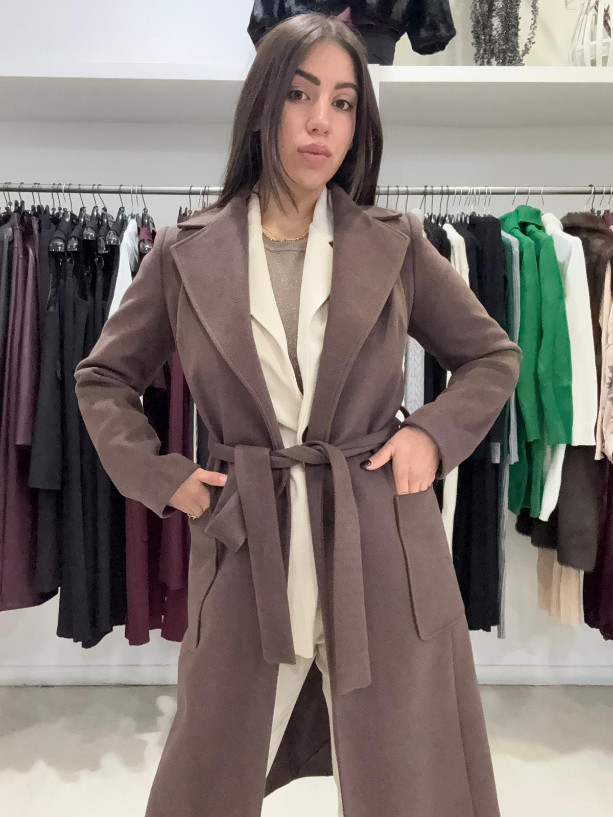 Morbido e avvolgente, dal taglio lungo stile vestaglia con tessuto diagonale caldo. Perfetto per look eleganti e casual durante le stagioni fredde.